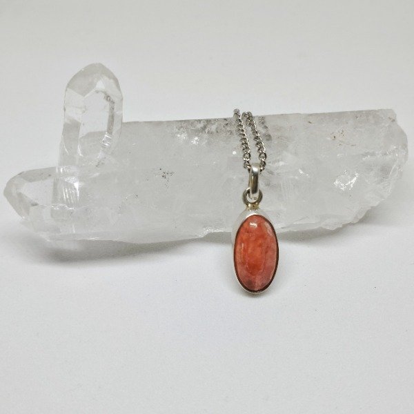 Colgante de Rodocrosita ovalado de 1,5cm de largo y 0,8cm de ancho. Incluye cadena de acero quirúrgico de 50cm.